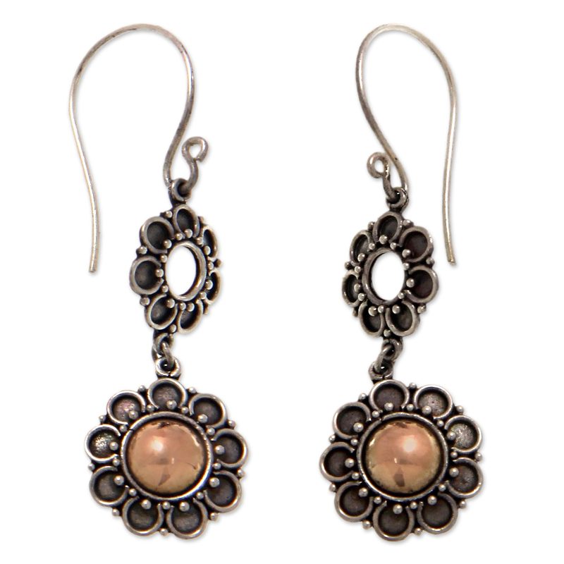 Sterling silver sunflowers are captivating as earrings crafted with an antiqued finished. By Diah Arini in Bali, the earrings are centered by sunny 18k gold plated accents.