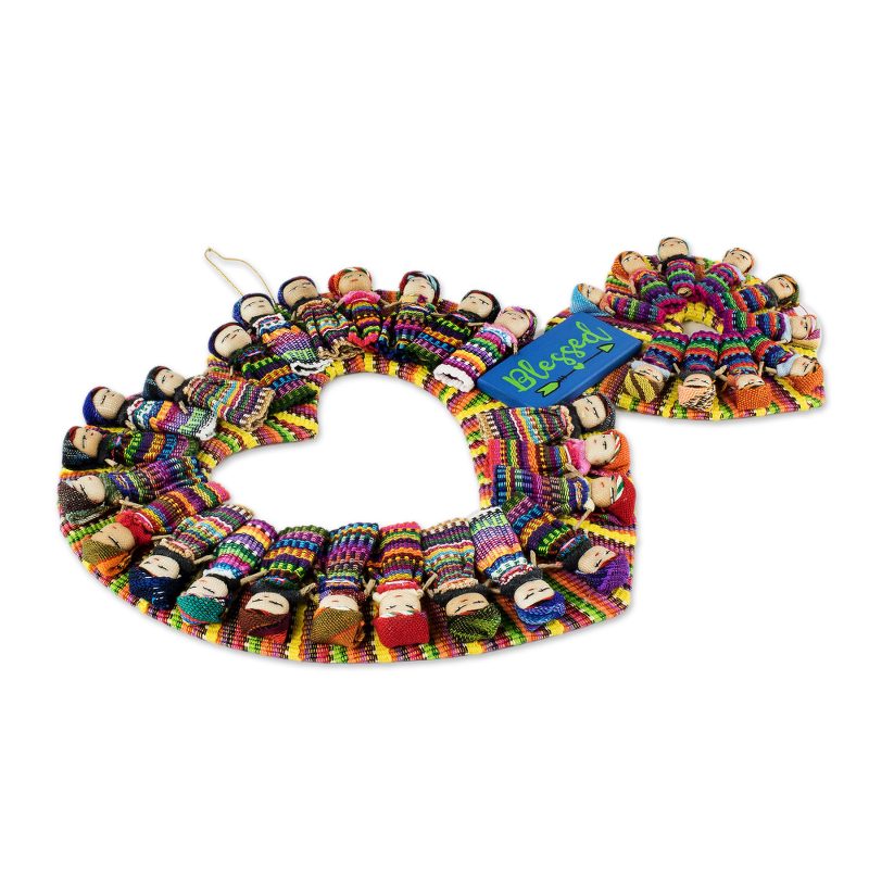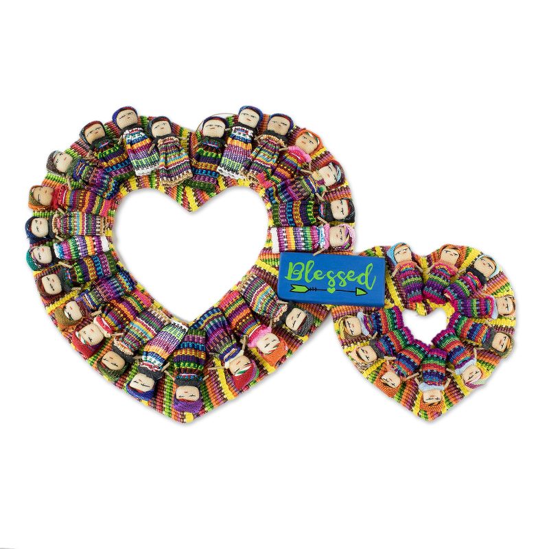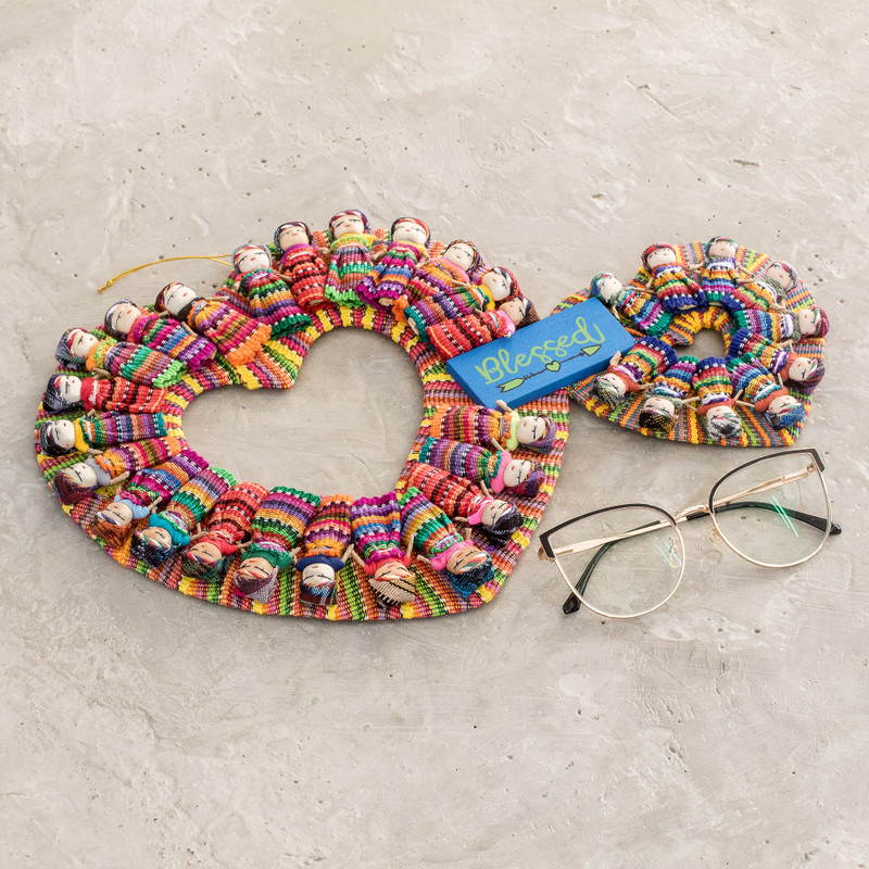 Delivery EstimateElias Garcia links two open hearts to represent love. Diminutive worry dolls in handwoven apparel stand shoulder to shoulder on a cheerful and unique double wreath; they are crafted by his sister of the Lopez Garcia family. Centering the hearts, a wooden plaque reads "Blessed." This charming design hangs from a golden cord.