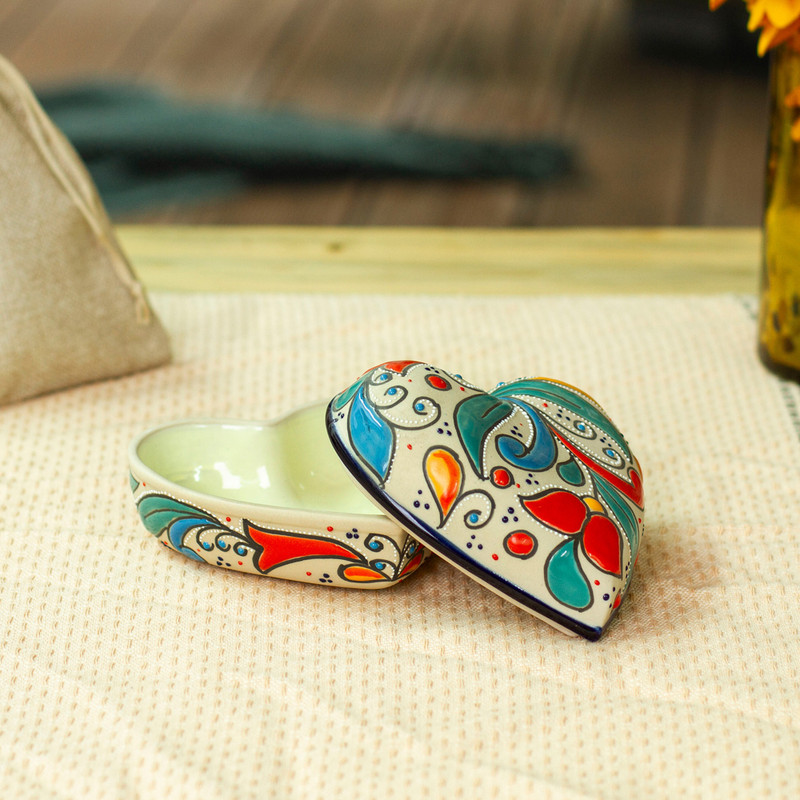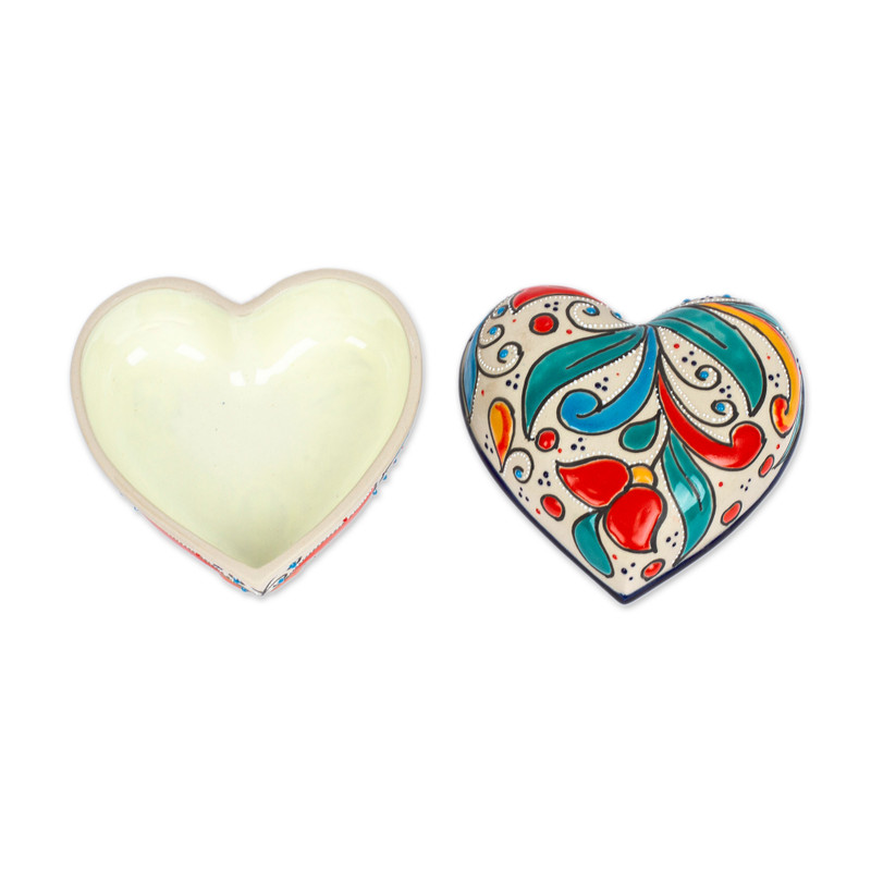 Crafted by hand in the traditional majolica style, this heart-shaped jewelry box is just right for small treasures. The Contreras Family hand paints each piece with brilliant colors for a truly eye-catching result.