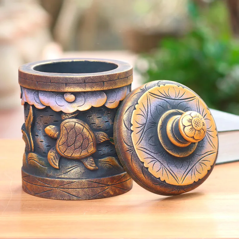 Balinese artisan Sarwaedi presents this charming decorative box, inspired by the Indonesian island of Serangan. The island is known primarily for its population of turtles, depicted here in a veritable turtle paradise. The artisan hand-carves clouds, reeds, and water and applies subtle touches of gilt and colored paints to emphasize the design.