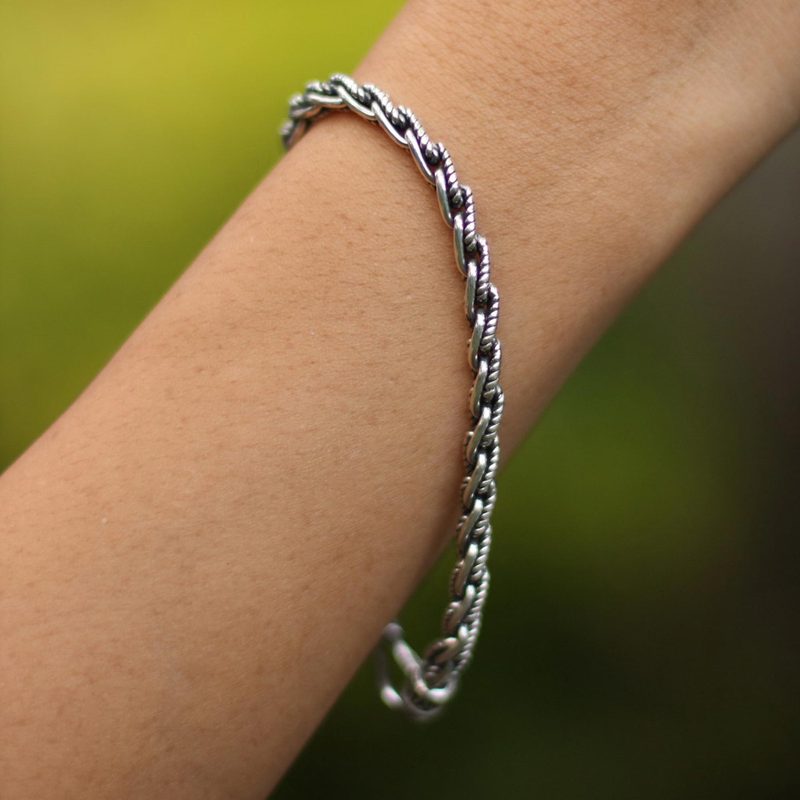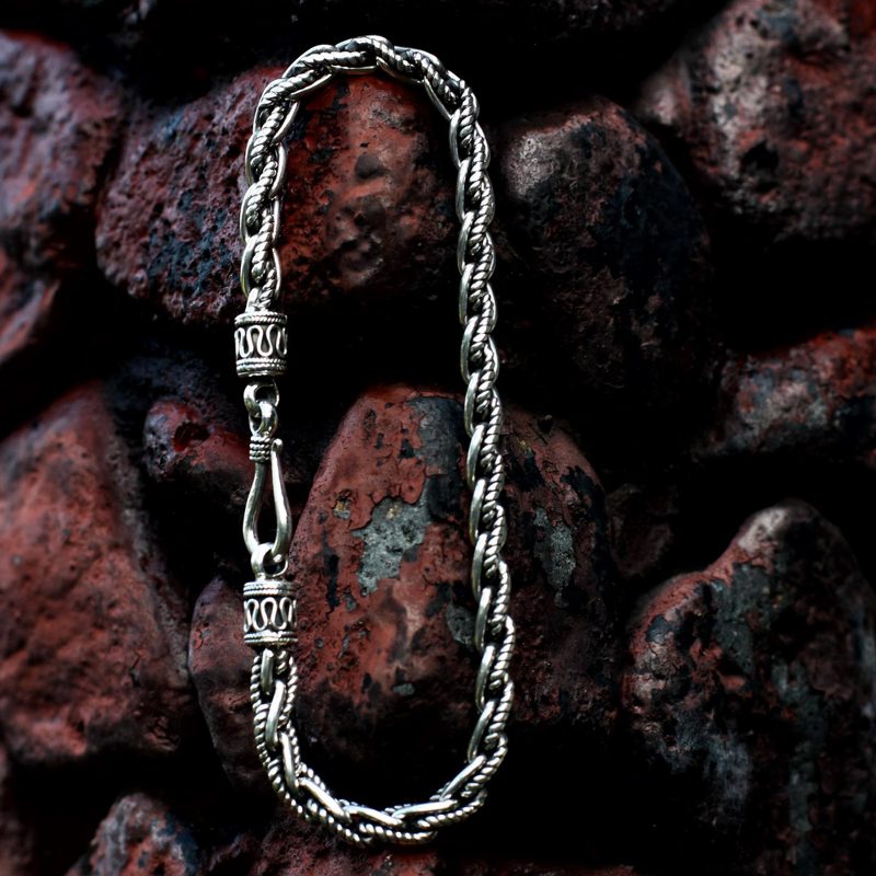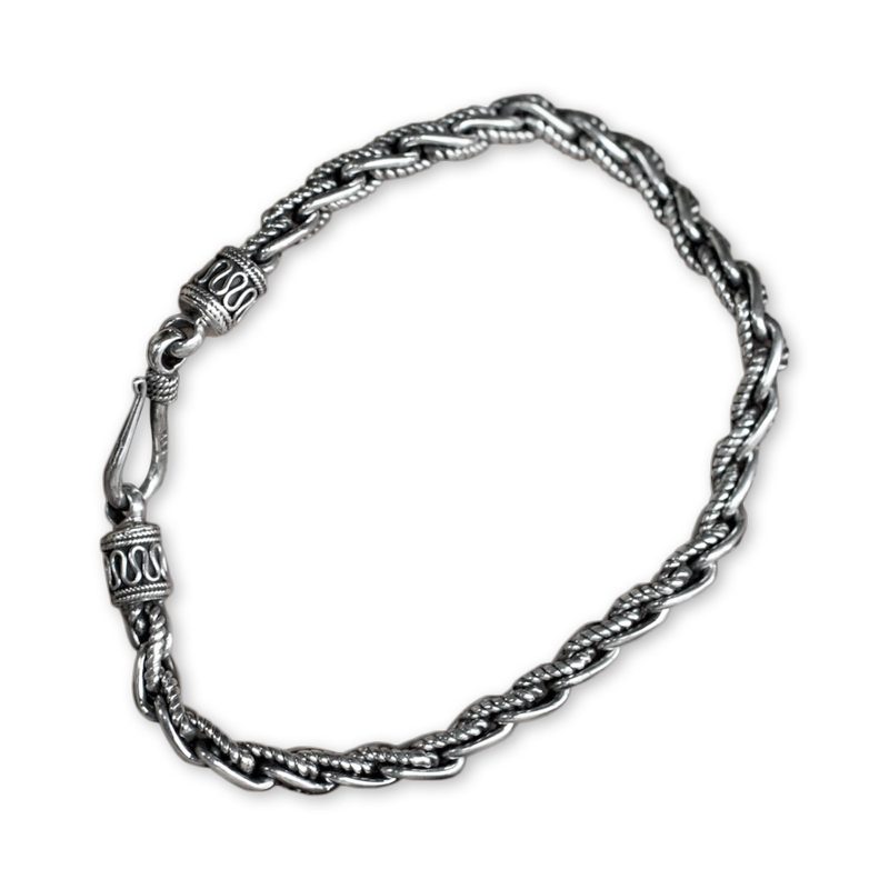 Rippling water rushes cheerfully along a riverbed, its enchantment captured in sterling silver. Wayan Asmana presents an original bracelet of fascinating textures. The chain ends with traditional Balinese design motifs.