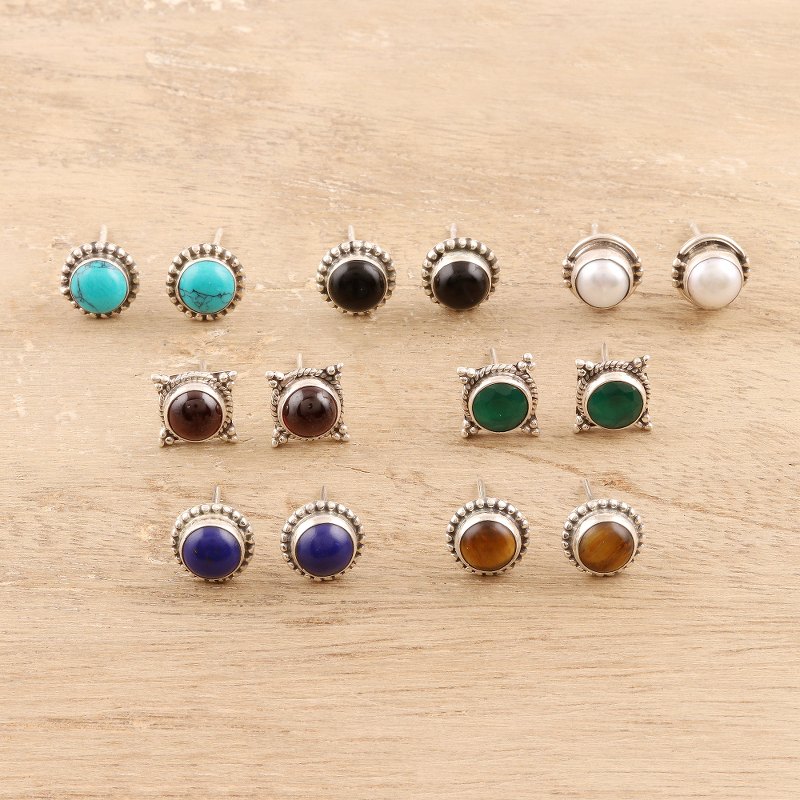 Framed by handcrafted sterling silver designs, various gemstones are displayed in this harmonious set of seven stud earrings from India. Bhavya Jain works with green and black onyx, lapis lazuli, tiger's eye, composite turquoise, garnet and cultured pearl to create this set, which arrives with a felt patch that is embroidered with the days of the week; store your earrings on this patch that also provides a fun way to wear each one!