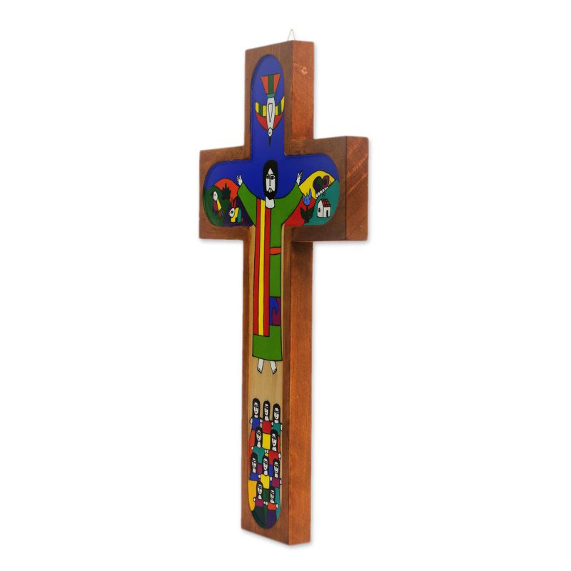 As part of an effort to provide a steady stream of work for its artisans, Salvadoran cooperative God's Seed presents this religious wall cross. Crafted of pinewood, the cross features hand-painted designs that depict Jesus Christ, surrounded by birds, onlookers, and the countryside of Emmaus, a town from the Gospel of Luke.