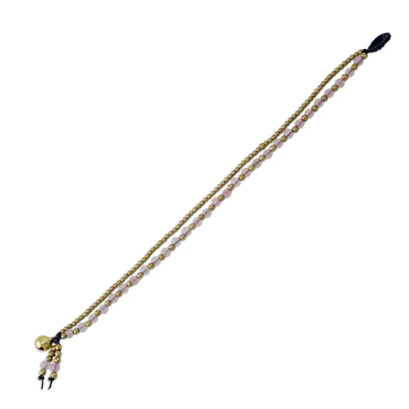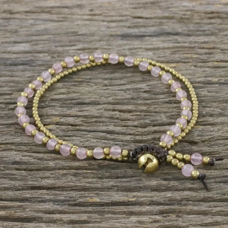 Thailand's Tiraphan Hasub orchestrates a dazzling harmony of colors with the design of this bracelet. She crafts the bracelet by hand, combining rose quartz and glistening brass beads. The bracelet has a loop and hollow brass bell closure.