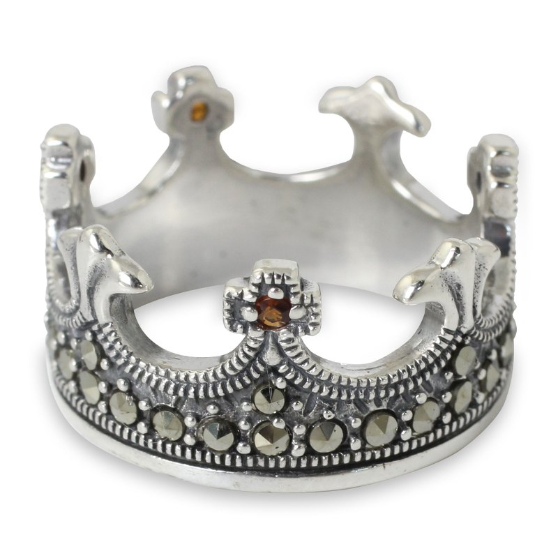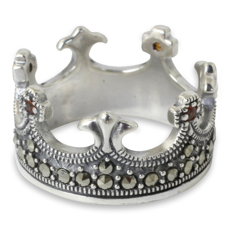 Faceted garnets adorn a regal design by Narinee in Thailand. Shaped like a crown, the handcrafted sterling silver ring is studded with marcasite gems for added sparkle.