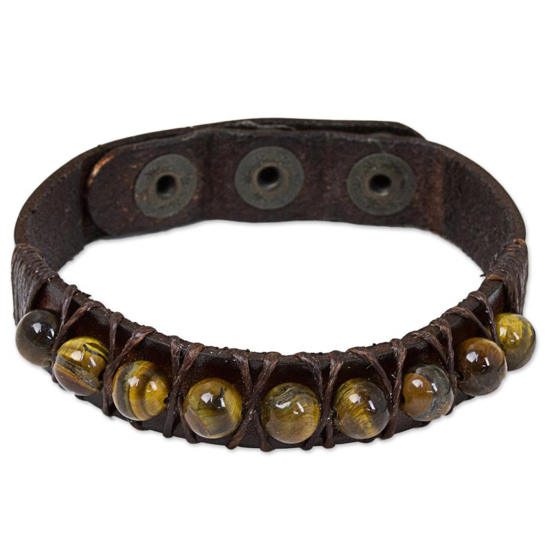 Beads of tiger's eye shimmer with an earthy glow separated by dyed polyester waxed cord in this leather band bracelet from Thailand. Chaloemphon hand crafts this dark brown toned bracelet from high quality leather to create this stunning accessory. It features three separate brass snap clasps for adjustable length.