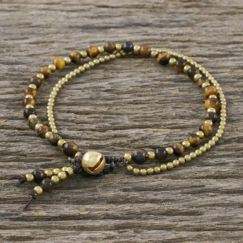 Thailand's Tiraphan Hasub orchestrates a dazzling harmony of colors with the design of this bracelet. She crafts the bracelet by hand, combining tiger's eye and glistening brass beads. The bracelet has a loop and hollow brass bell closure.