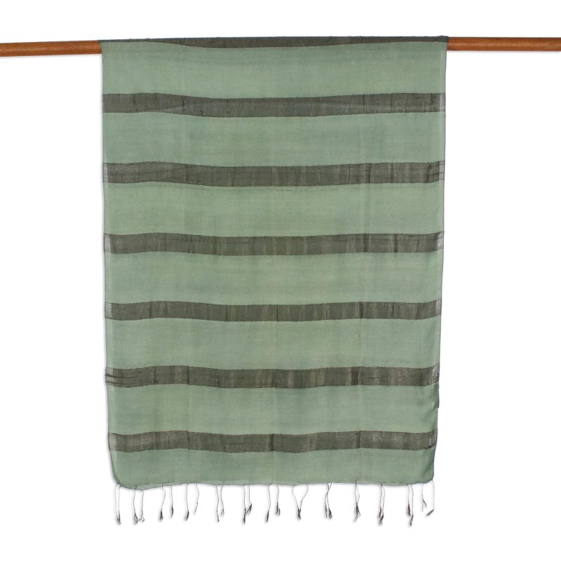 Evoking the beauty of nature, this handwoven scarf is elaborated with striped patterns of olive and sage. Thai artisan Vinita designs the scarf, diligently weaving it of silk and rayon. It is completed with petite fringes at the ends.