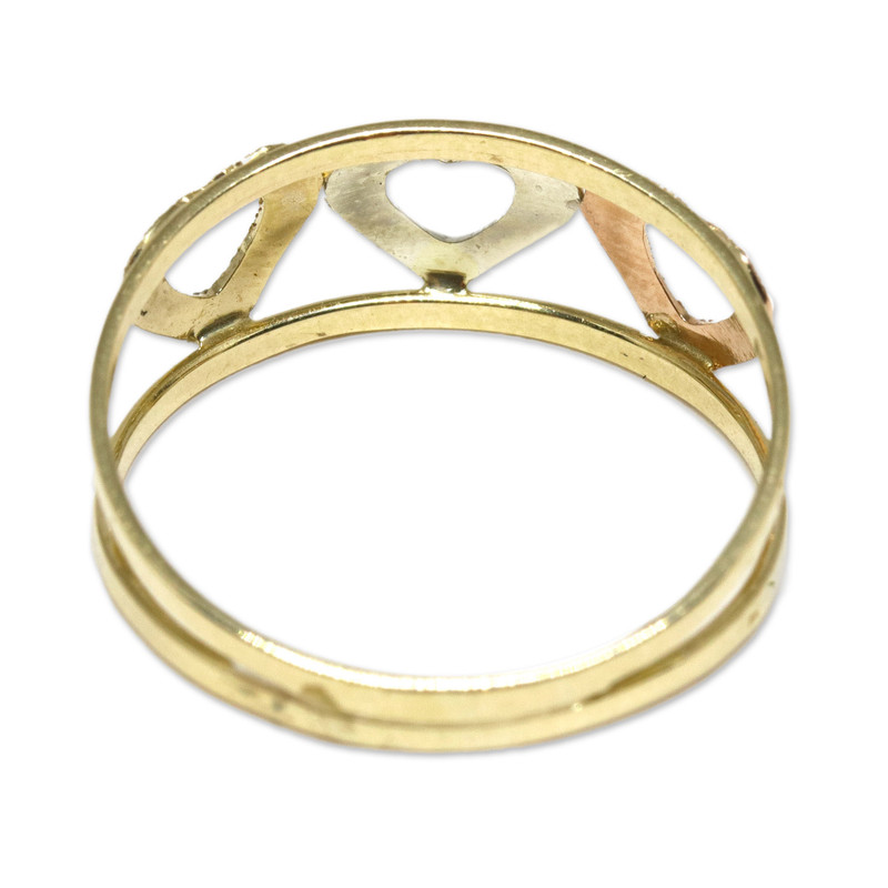 Three hearts center an elegant band ring, circling the finger with 10k white, rose, and yellow gold for a tricolor accessory. The Biason Family of Brazil designs this loving ring, crafting the band of yellow gold with open space in the center that houses the stippled hearts.