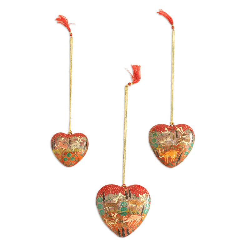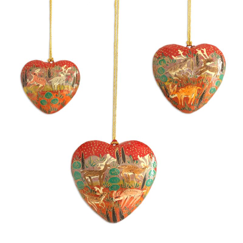 India's Syed Izaz Hussein crafts three festive holiday ornaments by hand from papier mache using time-honored methods. The set of three heart-shaped ornaments is then painted with the flora and fauna of the jungle for an interesting addition to your Christmas tree. The ornaments arrive on golden cords, ready to hang.