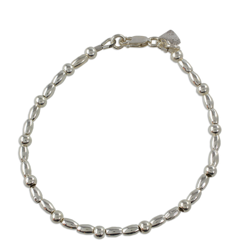 Representing an effort to provide young girls with artisanal skills, the Jalapa Girl Jewelsmiths of Guatemala present this gleaming bracelet. Oval and rondelle beads of high-polish sterling silver achieve a winning combination as they circle the wrist, closing with a lobster claw clasp of fine silver. The fingerprint of the artisan that crafted the bracelet adorns a small square tag alongside the clasp.