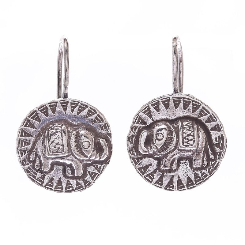 Working with artisans from the Karen hill tribes, Pakaon Sojintarit presents these Thai drop earrings. On each earring, an elephant is surrounded by sun rays in bold relief. A partially-oxidized finish accentuates the details.