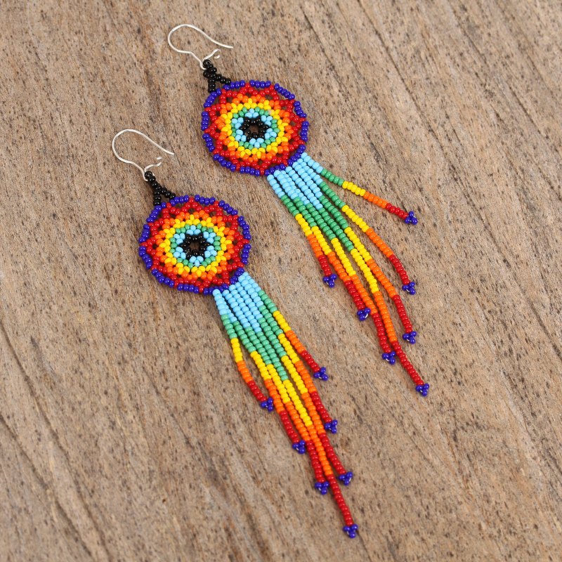 Working in the tradition of Huichol artistry, Adriana Trejo creates these beautiful waterfall earrings. She strings colorful glass beads by hand to create two circular shapes with beaded waterfalls below.