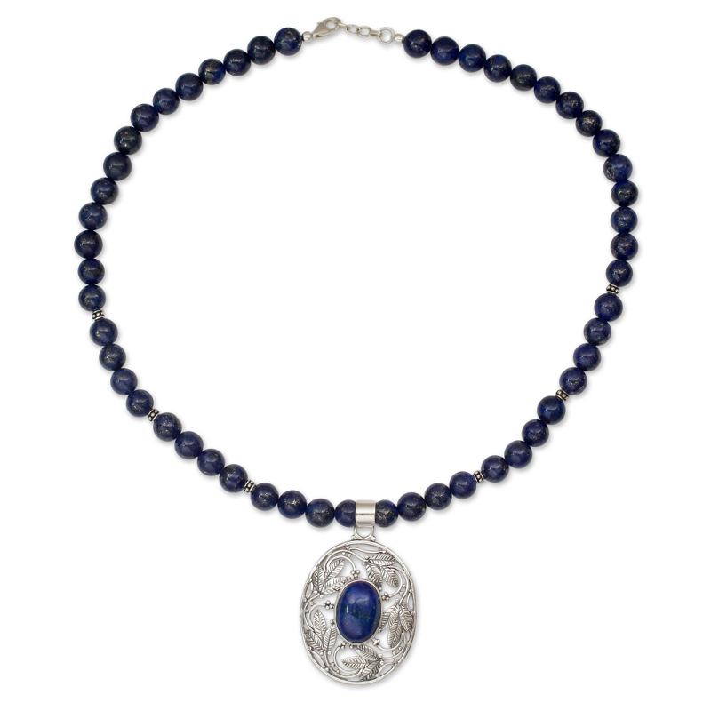 Mysterious and beautiful, lapis lazuli encloses shining flecks of color. Neeru Goel showcases the mysterious stone in a bold pendant necklace. Silver foliage whispers in the wind.