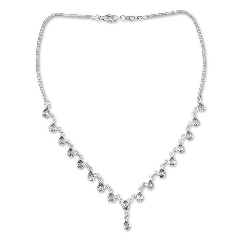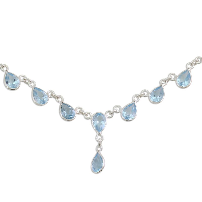 Raindrops glisten with ethereal charm as they hang from a cloud's silver lining. From India's Bhavesh, the illusion is created with over 13 carats of blue topaz, the stone of spiritual rejuvenation and also the December birthstone. Sterling silver surrounds each stone in this exquisite necklace.
