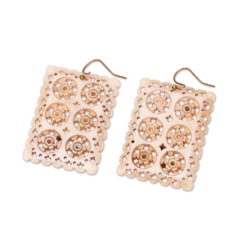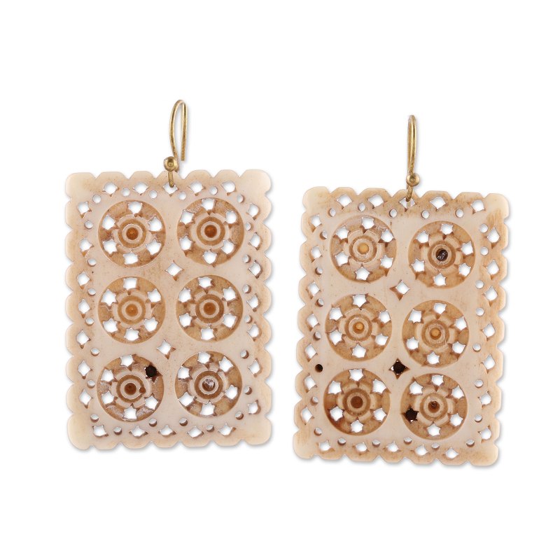 Presented by Arti Sharma, these dangle earrings will bring the elegance of traditional jali architecture to your home. Local artisans take two rectangular pieces of natural bone, diligently hand-carving openwork floral patterns. These majestic earrings swing from brass hooks.