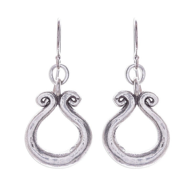 In this pair of dangle earrings, ribbons of Karen hill tribe 950 silver are curved to create an organic-shaped circle with a flourish where the circle joins at the top. Designed by Sasithon Saisuk of Thailand, the earrings are artfully oxidized to highlight the top scrolls. The earrings hang from silver hooks.