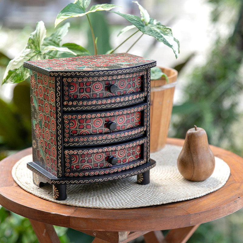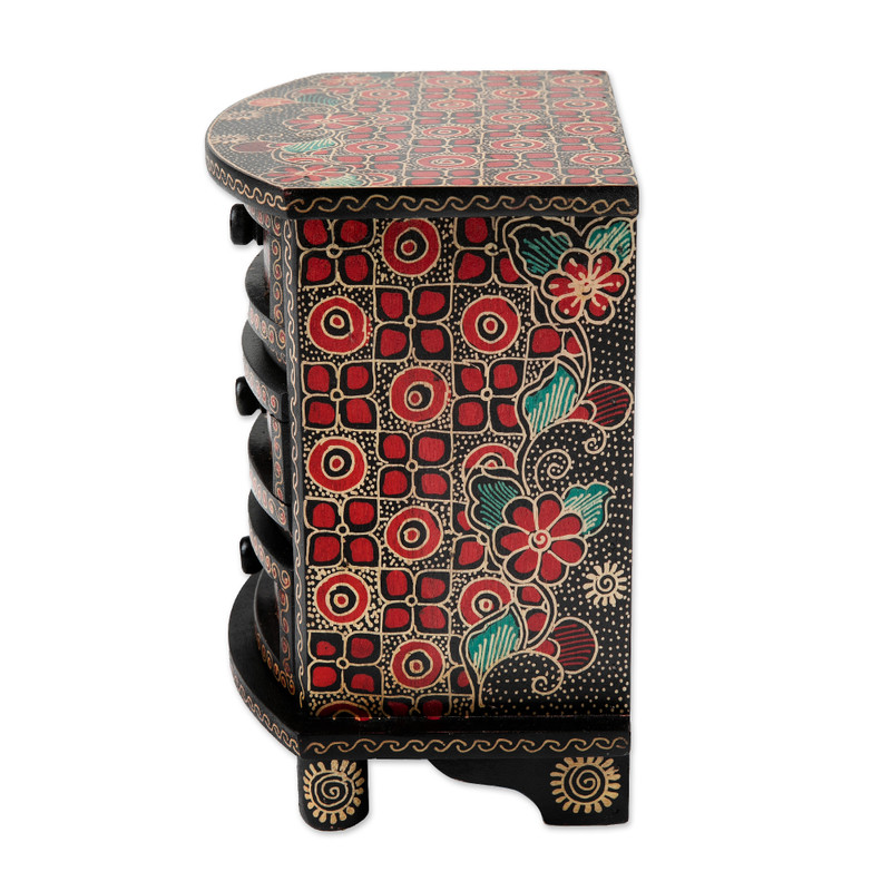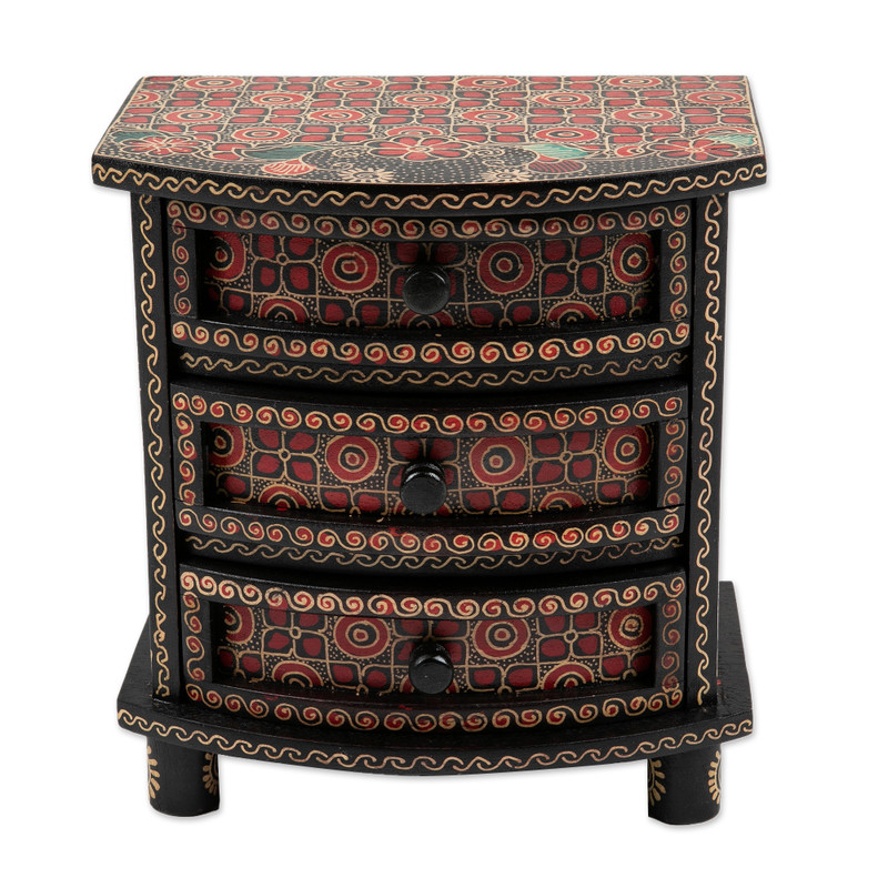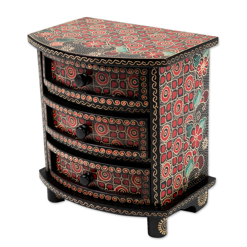 By Gunadi, this beautiful wood batik jewelry box is crafted by hand in black, and red with cool green leaves. The front, top and sides feature the kawung motif, one of Java's oldest batik designs once reserved for the royal family. Kawung depicts a cross-section of the aren palm fruit as four pointed ovals connected at the center. The cross it forms is believed by some to refer to the universal energy source. Three convenient drawers keep things organized.