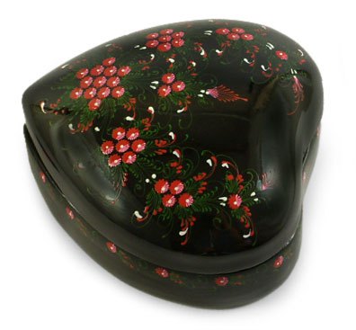 Hand-carved from mango wood, this heart holds secret treasures. Nantana Sompamitre creates an enchanting box using traditional Thai techniques. She delicately paints pink flowers on the midnight beauty of rich black lacquer.
