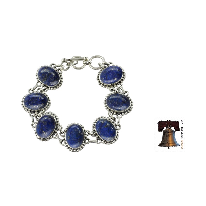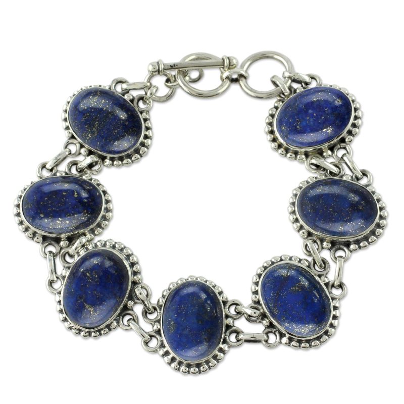 Revealing golden flecks, deep blue gemstones lend their mystical allure to this handcrafted bracelet. Shanker designs the piece and showcases lapis lazuli, the birthstone of September, in ornate sterling silver settings.
