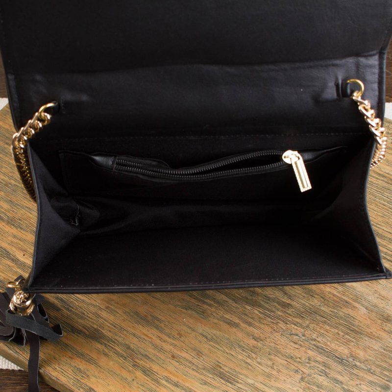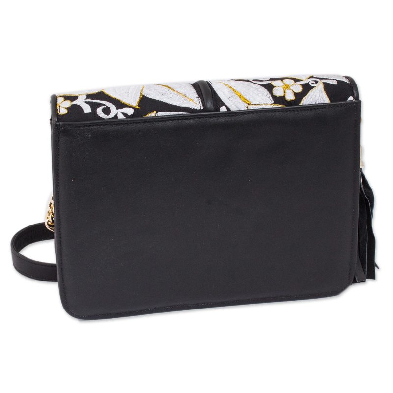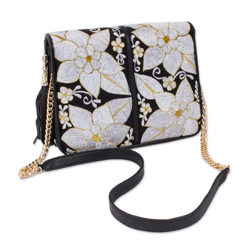 Beautiful and elegant, this sling from Mexico is designed and crafted by Fabiola Gonzalez. She selects a panel of cotton that features exotic white floral embroidery, accented by black leather. This handbag drapes over the shoulder on a stainless steel chain strap. A leather tassel dangles from one side. The front flap of this bag opens with a magnetic snap, revealing a lined interior in black with a divider that creates two compartments. The divider features a zipper pocket for storing small items .