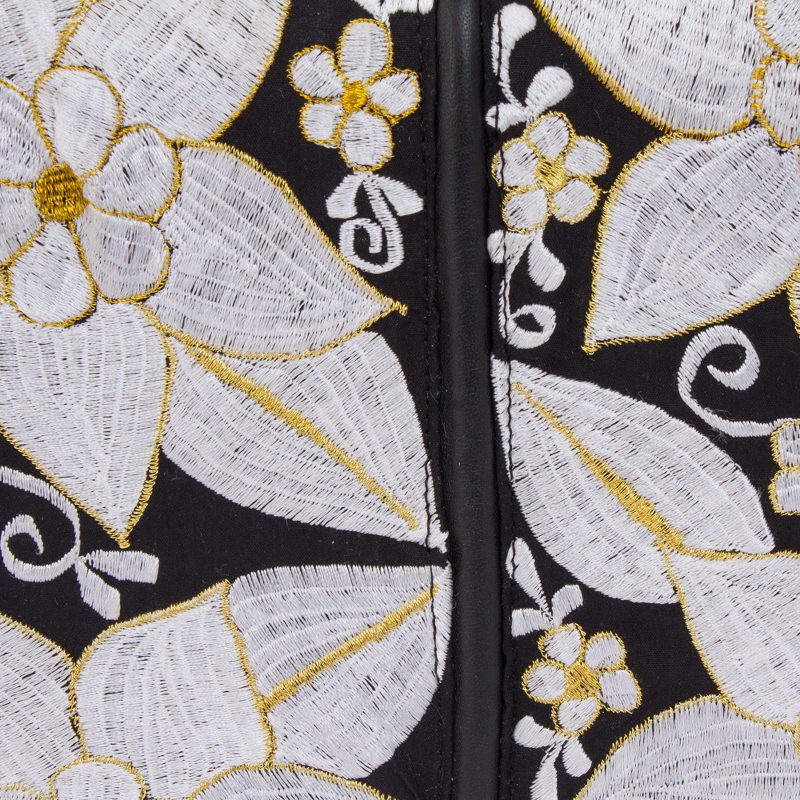 The embroidery is done on large pieces of fabric, then the artisan selects a portion of it for her handbags. Thus, the motifs and their placement can vary, making each purse an absolutely unique work of leather art. The theme and colors are the same.
