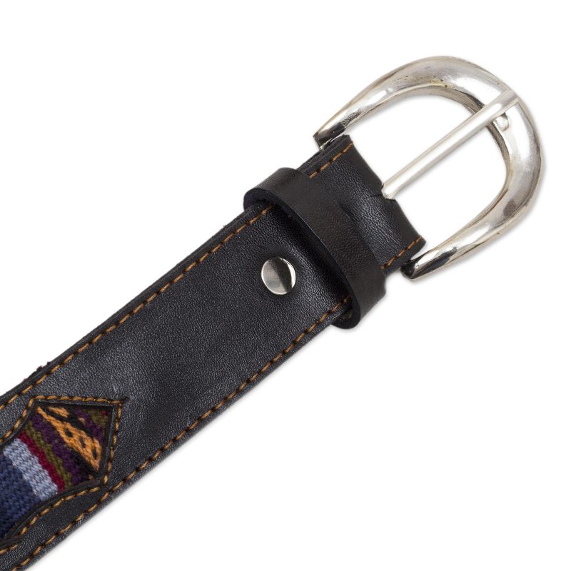 This beautiful belt is the design of Kathiana Quispe in Peru. Crafted from top-quality black leather, the belt features inset panels of hand-loomed wool with traditional Andean motifs. A polished silver-toned buckle completes the design.