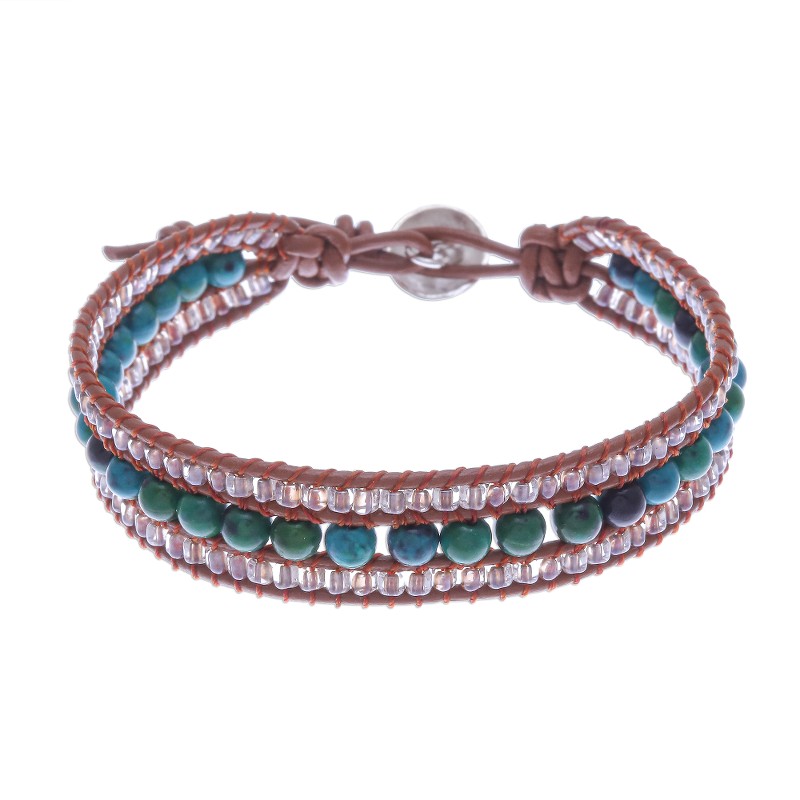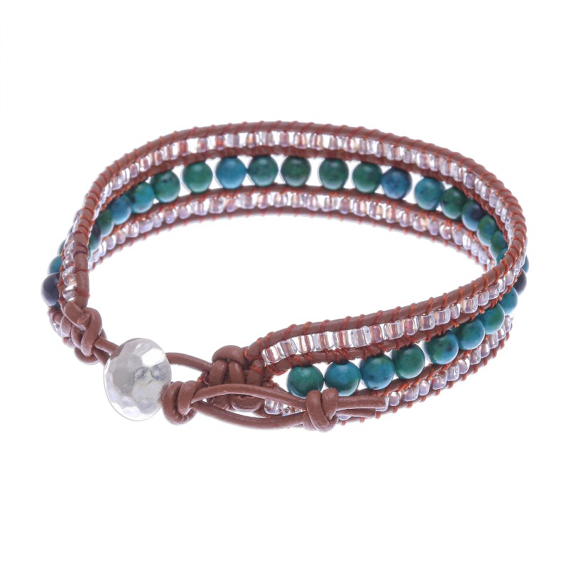 Thai artisan Siriporn creates this pretty bracelet with enhanced blue and green serpentine and petite clear glass beads. The beads are knotted on brown leather cords in three rows. The bohemian-chic bracelet fastens at one of two lengths with a hammered 950 silver button.