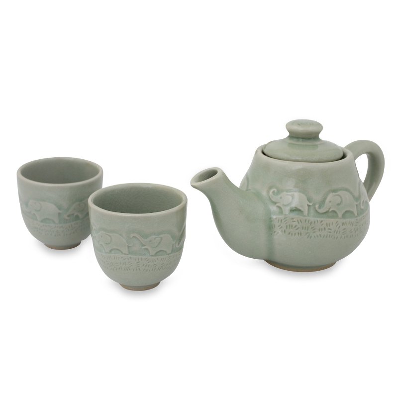 A charming family of elephants makes a lap around this tea set from Thai artisans Thatsanee and Ramphan. The teapot, strainer and 2 cups are crafted of celadon ceramic using ancient techniques, and given the traditional pale green crackle glaze.