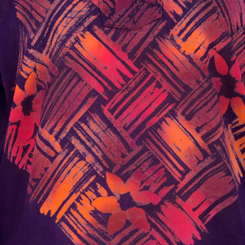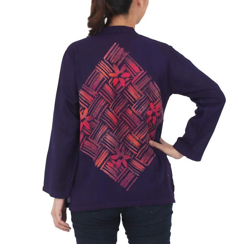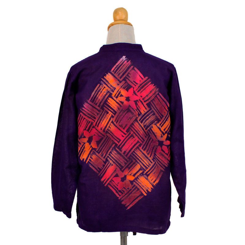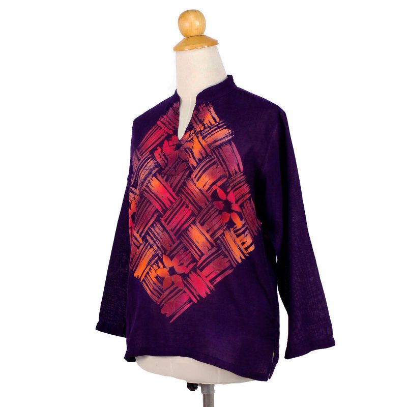 This exotic blouse features a batik design expertly hand-painted by artisan Chomsuda Samana of Thailand. Rich purple in color, the blouse has a pink and orange woven pattern on both the front and back. Made from 100% cotton voile, the lightweight shirt has long sleeves and an open mandarin collar.