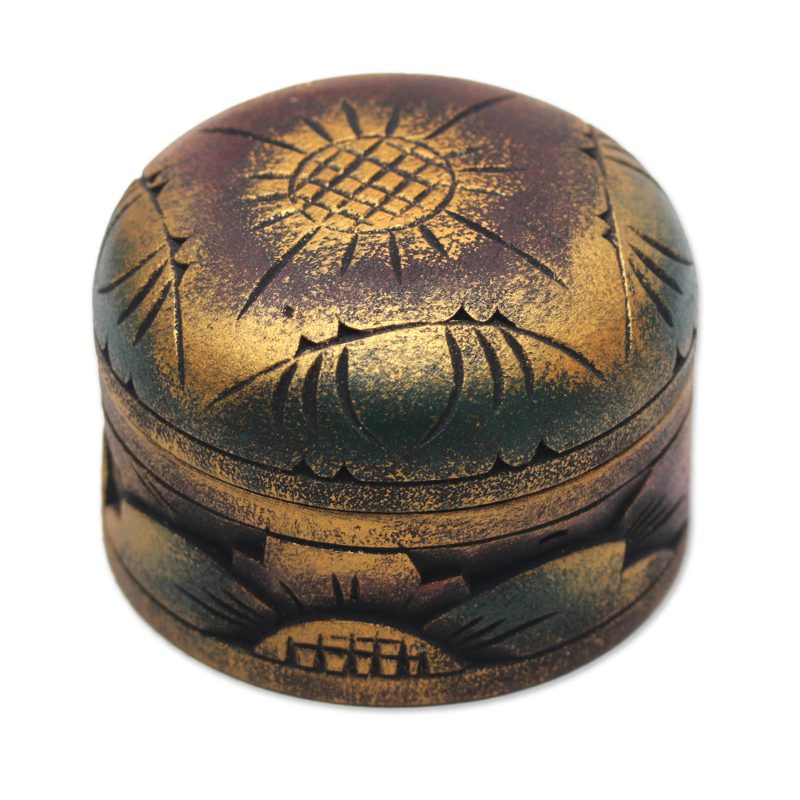 Indonesian artisan Sarwaedi employs timeless mahogany wood to craft this exquisite keepsake box. Engraved with intricate bougainvillea, the petite box receives an antique gold finish to highlight the details, and is perfect for rings, earrings and other small accessories.