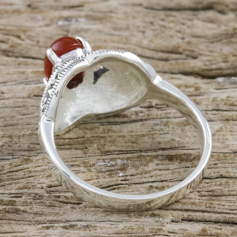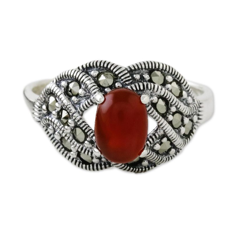 Because of its popularity during the Victorian era, marcasite gives jewelry a wonderfully vintage feel. It is a particular favorite of Thai artisan Narinee, who uses the stone in this pretty sterling silver cocktail ring. The marcasite gems surround a cabochon of enhanced red-orange onyx in a prong setting.
