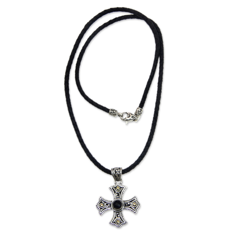 Putu Gede Darmawan of Bali presents a magnificent Maltese-style cross pendant necklace for men. The pendant is crafted from sterling silver with gleaming 18k gold accents. A checkerboard-cut round onyx gemstone centers the pendant, which is suspended on a braided black leather cord.