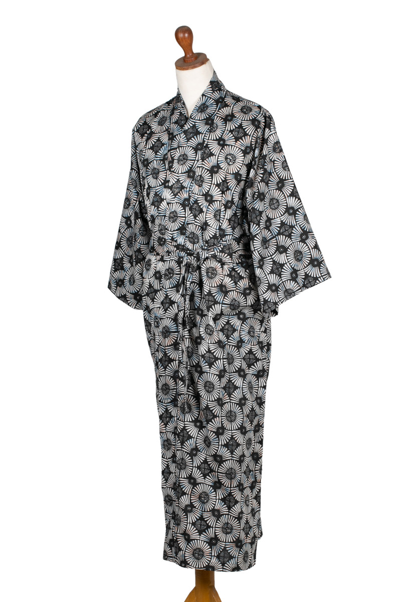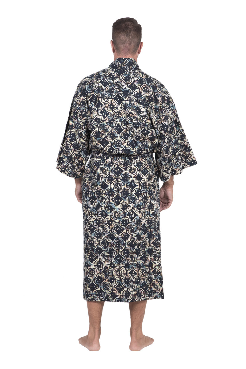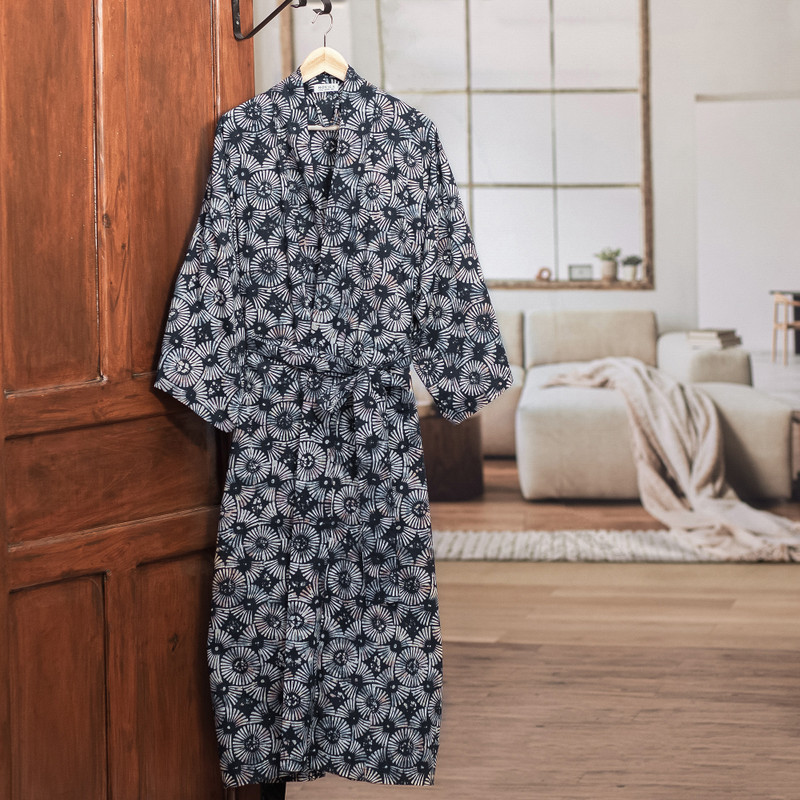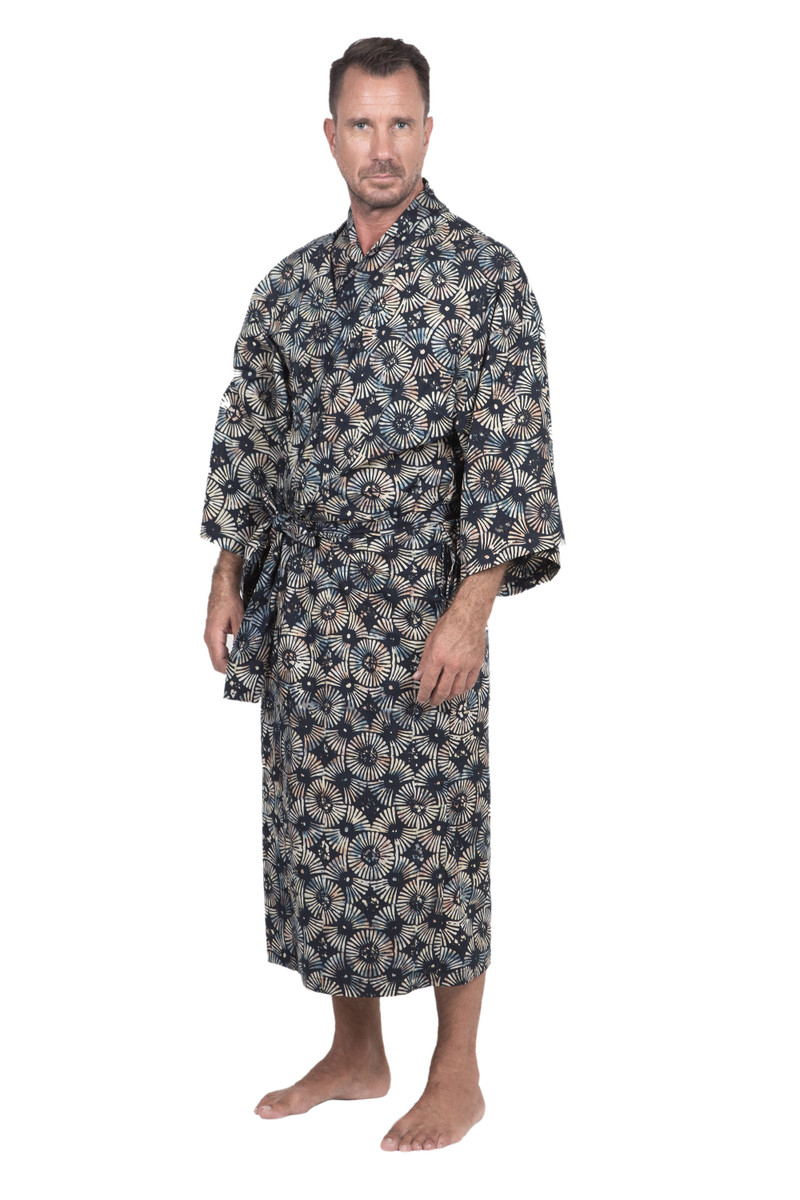 Evoking fireworks in dark blue-to-black and white, Saktut Raitawati designs a comfortable cotton robe for men. Bali's traditional batik technique is used to create them. Classic front-wrap styling, wide kimono style sleeves and a matching tie belt make a handsome combination.