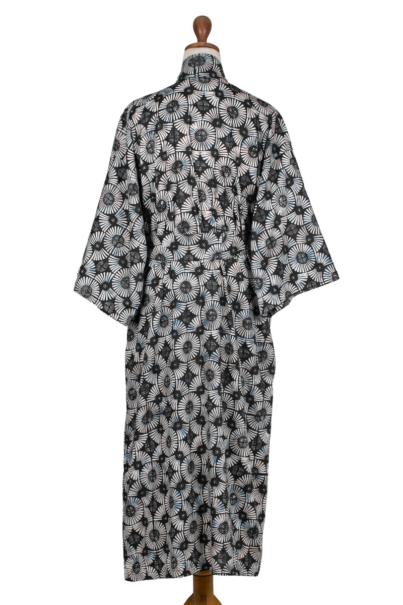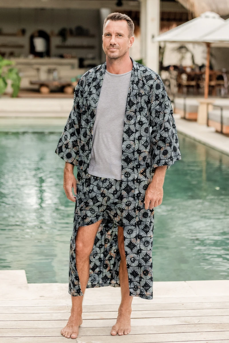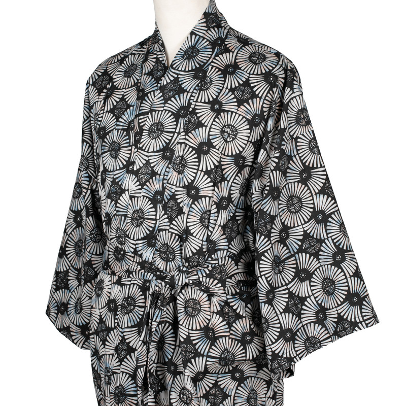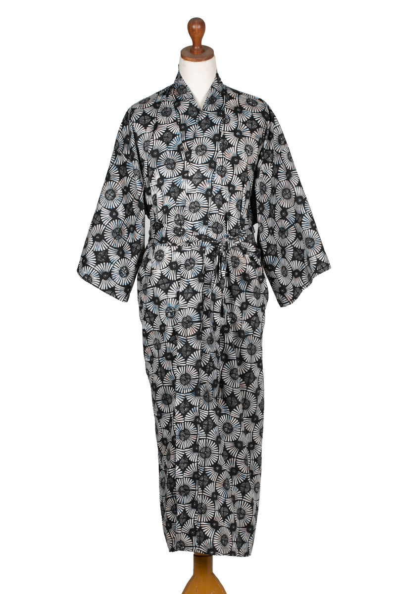 Evoking fireworks in dark blue-to-black and white, Saktut Raitawati designs a comfortable cotton robe for men. Bali's traditional batik technique is used to create them. Classic front-wrap styling, wide kimono style sleeves and a matching tie belt make a handsome combination.