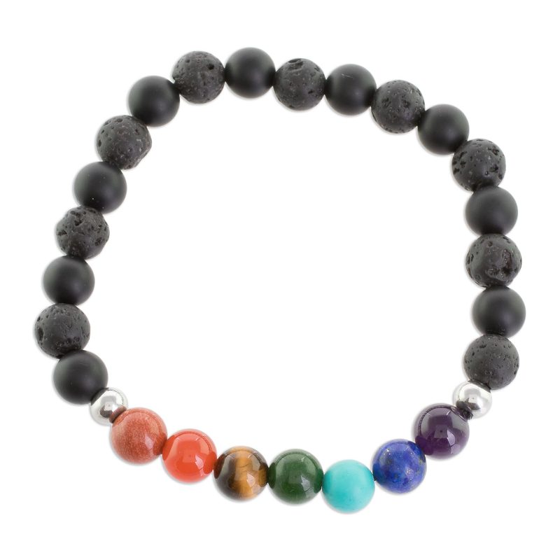 Delivery EstimateCreating the perfect accessory to unleash your chakra, Costa Rican artisan Efrain Espinoza designs this bold and masculine stretch bracelet. A multi-gem array of amethyst, lapis lazuli, reconstituted turquoise, jade, tiger's eye, carnelian, and agate form the seven chakras, flanked by stainless steel beads. Alternating beads of natural lava stone and black agate circle the wrist.