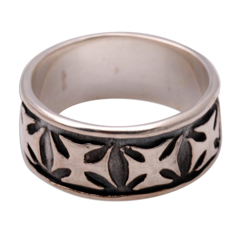 A series of formée crosses in polished silver align on a ring by Nyoman Rena. Designed for men, it contrasts burnished silver with darkened finishes.