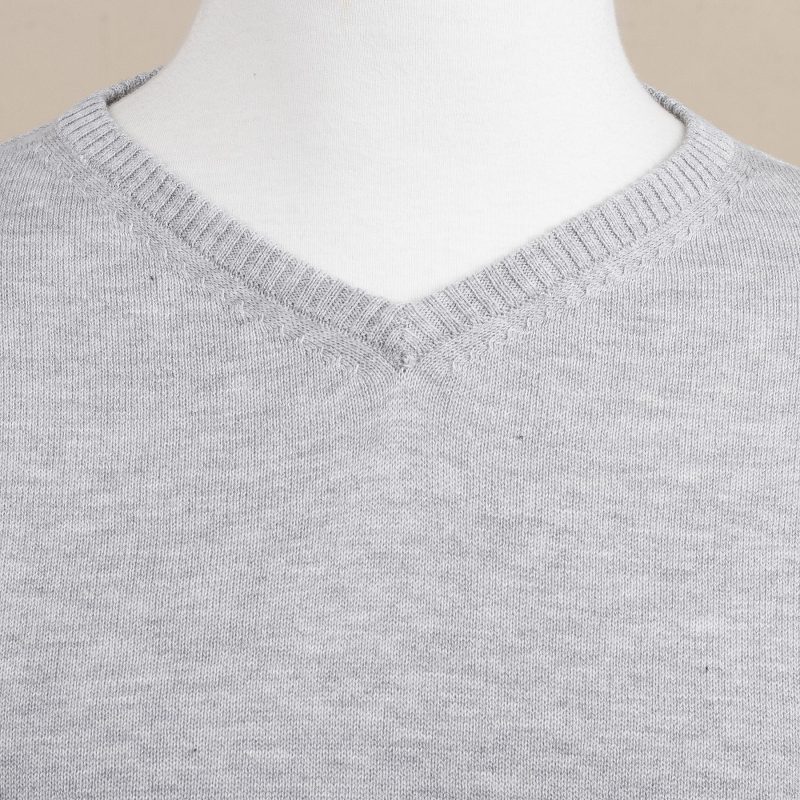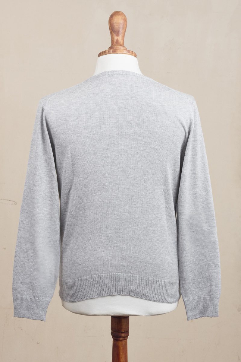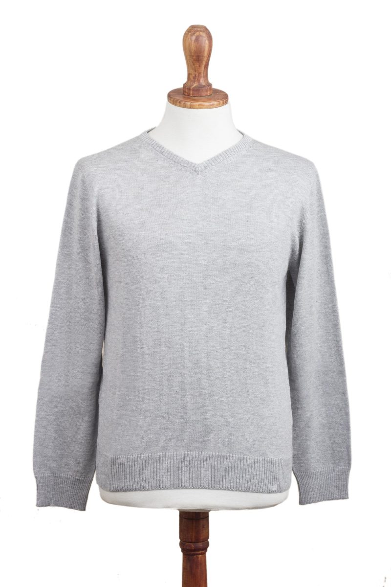 For a comfortable companion on your adventures, this men's pullover from Peru is designed by Violeta Pacheco. She works with a cotton blend in solid pearl grey to knit this men's top, which features a V-neck and long sleeves. This pullover's lightweight design makes it perfect for the spring and summer months.