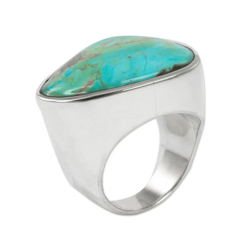 Bold, sleek and contemporary, this ring by Guillermo Arregui exalts both its earth elements. He works in Taxco's legendary sterling silver, crowning the polished design with a rounded triangle of natural turquoise.
