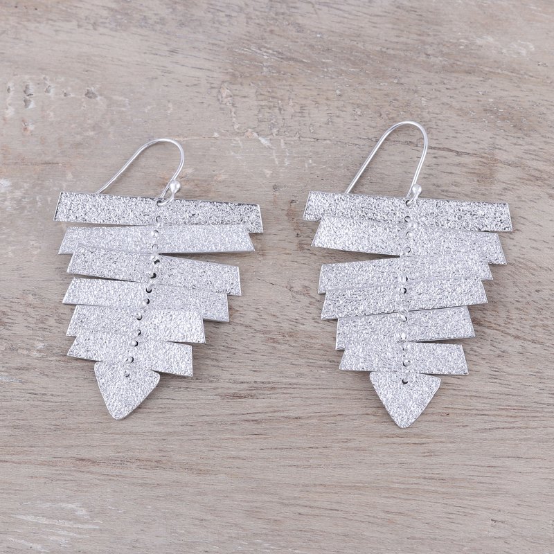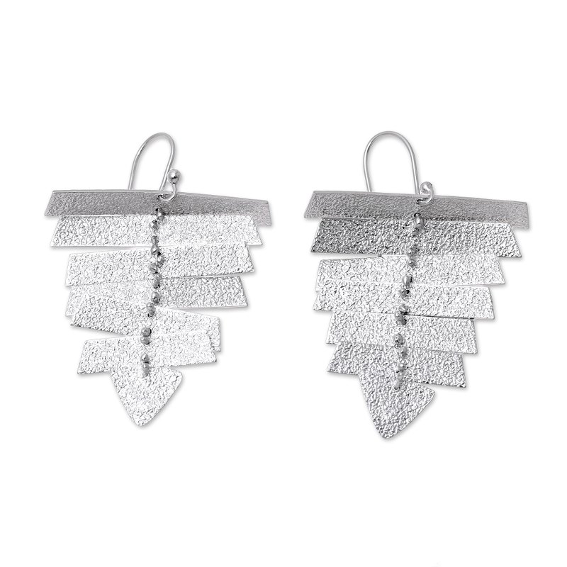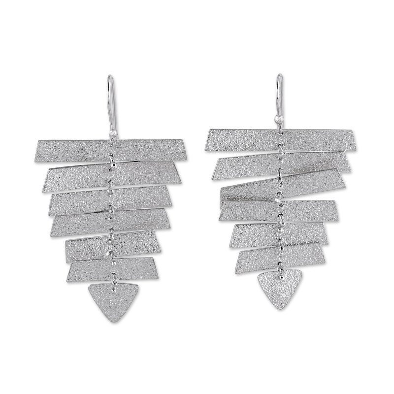 Crafted of sterling silver bathed in gleaming rhodium, these pointed dangle earrings will add a touch of modernity to your wardrobe. Sandblasted forms of descending size are all linked together, dangling with elegance. Indian artisan Sehal Agarwal designs this lovely accessory.