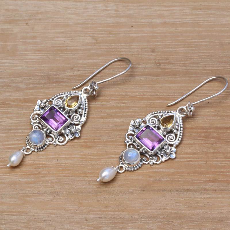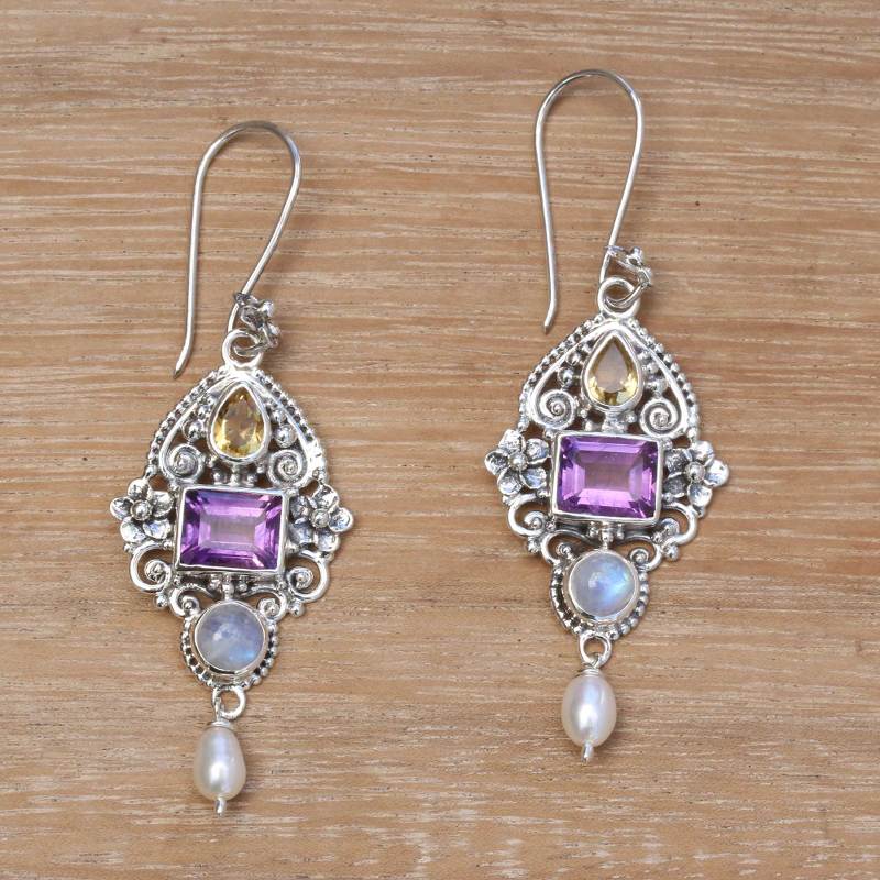 Ornate sterling silver scrollwork complements beautiful gemstones in this pair of dangle earrings handcrafted by Balinese artisan Buana. In the center of each earring are gemstones of citrine, amethyst, and rainbow moonstone, each with a different cut. Nestled amongst the scrollwork are sterling silver flowers, and a cultured freshwater pearl dangles from the bottom of each earring.