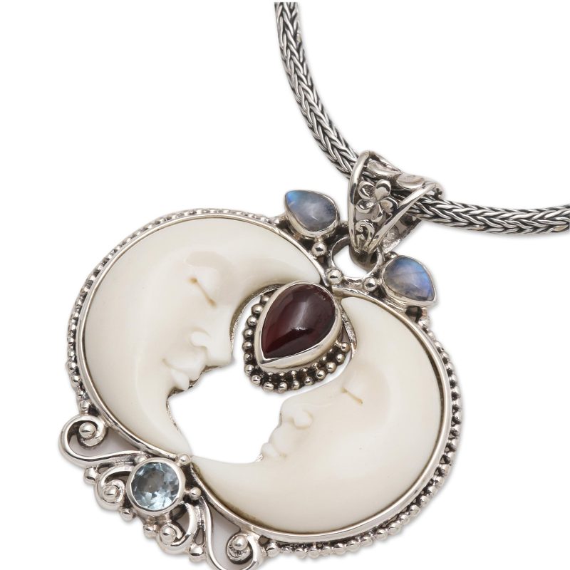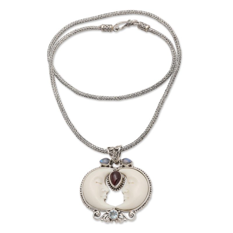 Designed by Buana in Bali, this sterling silver pendant necklace is wonderfully romantic. Two dreamy crescent moons, carved of smooth white bone, face each other. Surrounding the moons are cabochons of garnet and rainbow moonstone as well as a faceted blue topaz. The necklace is attached to a sterling silver naga chain with a floral bail.