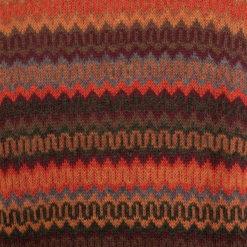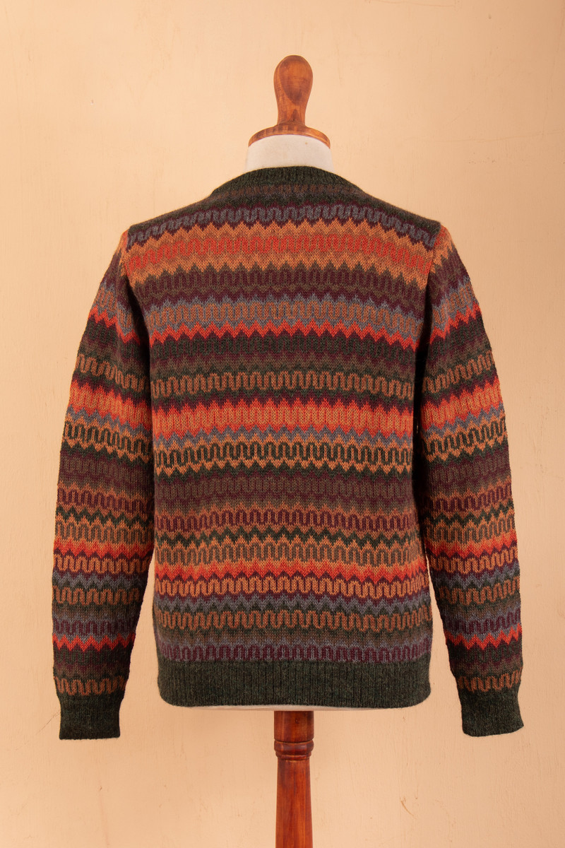 Precisely knitted motifs distinguish this handsome men's sweater from Peru's Fernando Cano. Working in luxurious alpaca wool, he creates a design of intricate geometry in shades of orange, beige, grey and red with forest green accents.