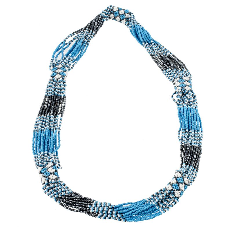 Delivery EstimateThis gorgeous long torsade necklace is the creation of Angelina Roquel from Guatemala. The artisan strings tiny glass beads by hand to create complex patterns in sky blue, titanium and white.
