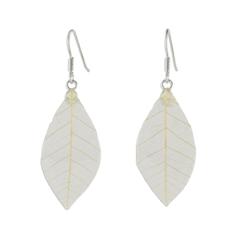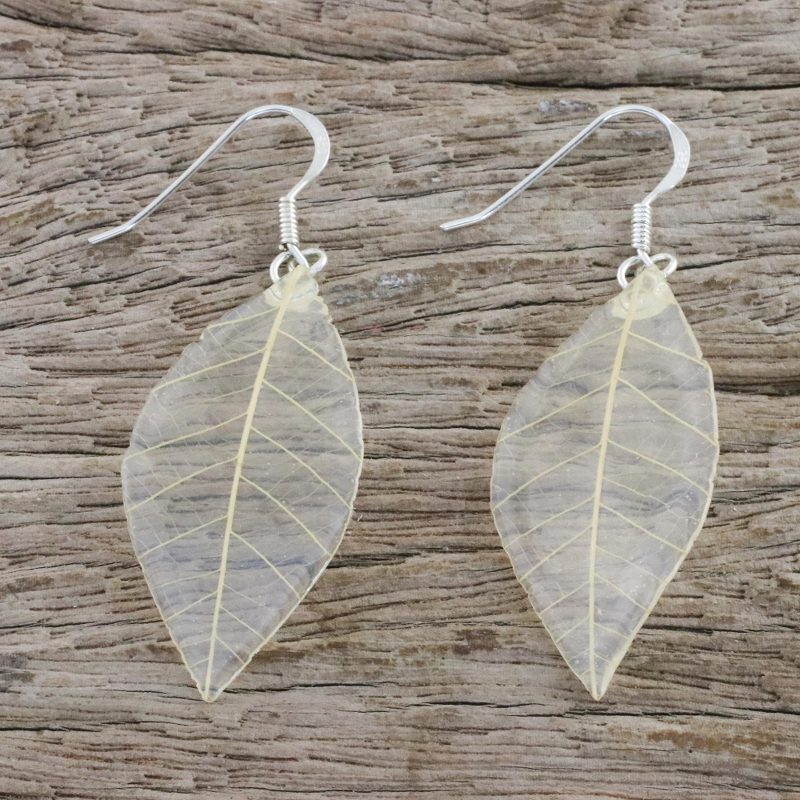 Danai presents an unforgettable pair of dangle earrings from Thailand. Local artisans carefully select two rubber tree leaves, preserving them through a painstaking process that adds a clear resin coating. The veins of each leaf are highlighted with a soft color in straw. These translucent dangle earrings celebrate the stunning beauty of nature, adorning the ears on hooks of sterling silver.
