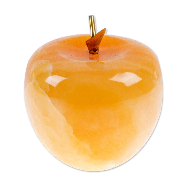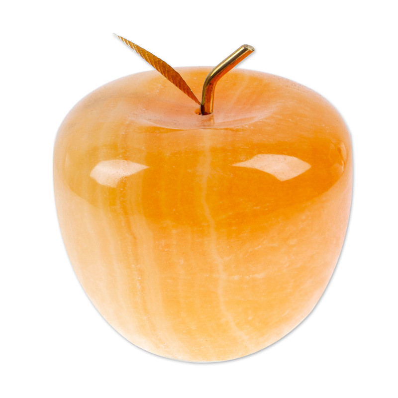It is said the apple stands as symbol of totality and earthly desires, inspiring the Sierra Family in the creation of this figurine. They carve natural yellow onyx into the delicious fruit, expertly highlighting the stone's natural grain through the sculpture's smooth contours. A shiny brass leaf and stem complete the apple's tempting allure.