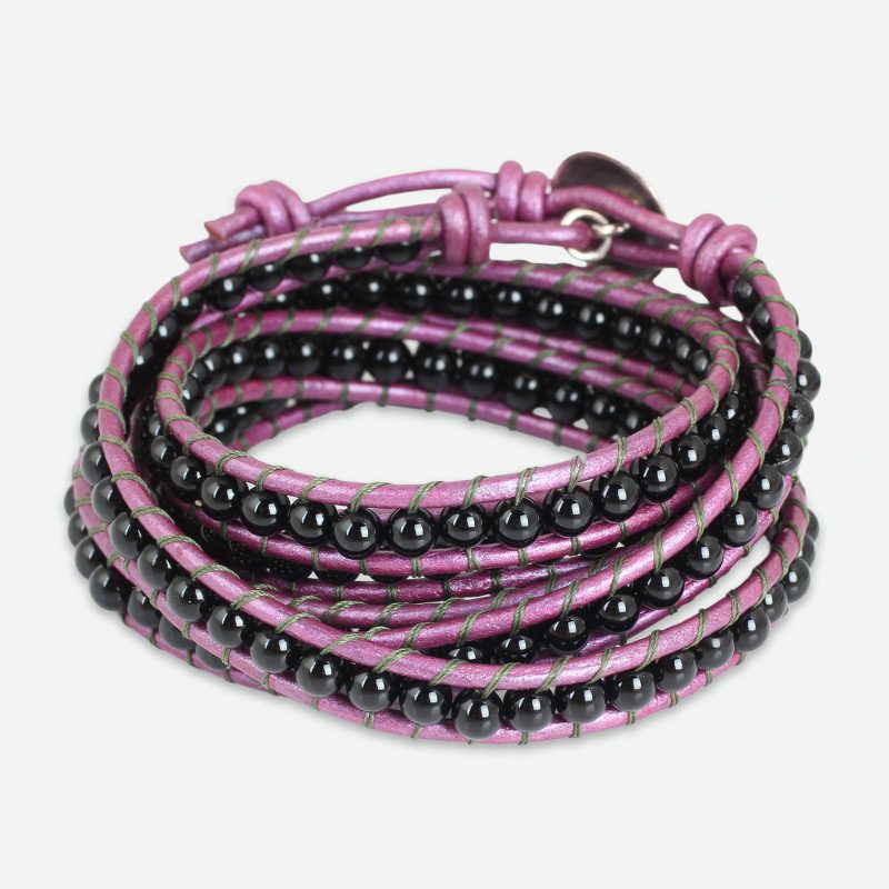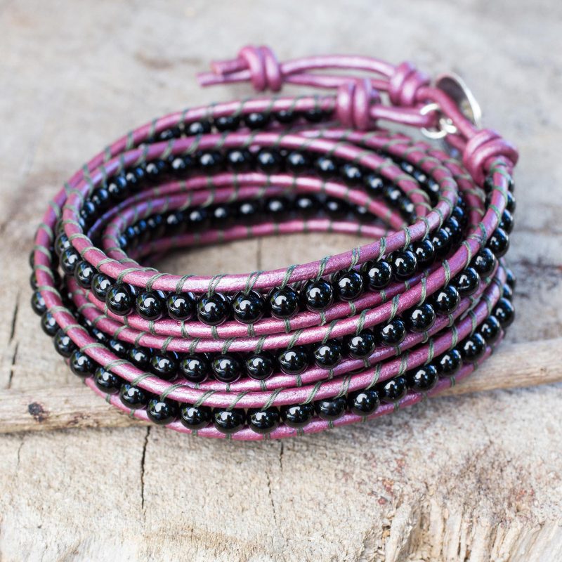 Knotted by hand on orchid leather cords, sleek black onyx whispers of romance. Thailand's Siriporn crafts this beaded wrap bracelet by hand and adds a floral silver bead with Karen hill tribe artistry.