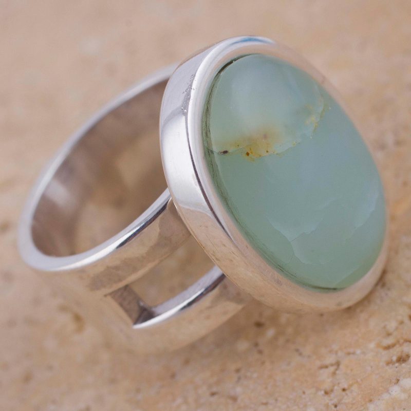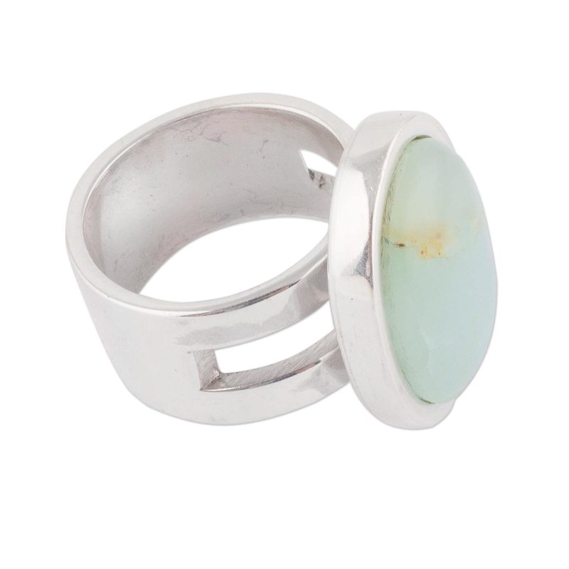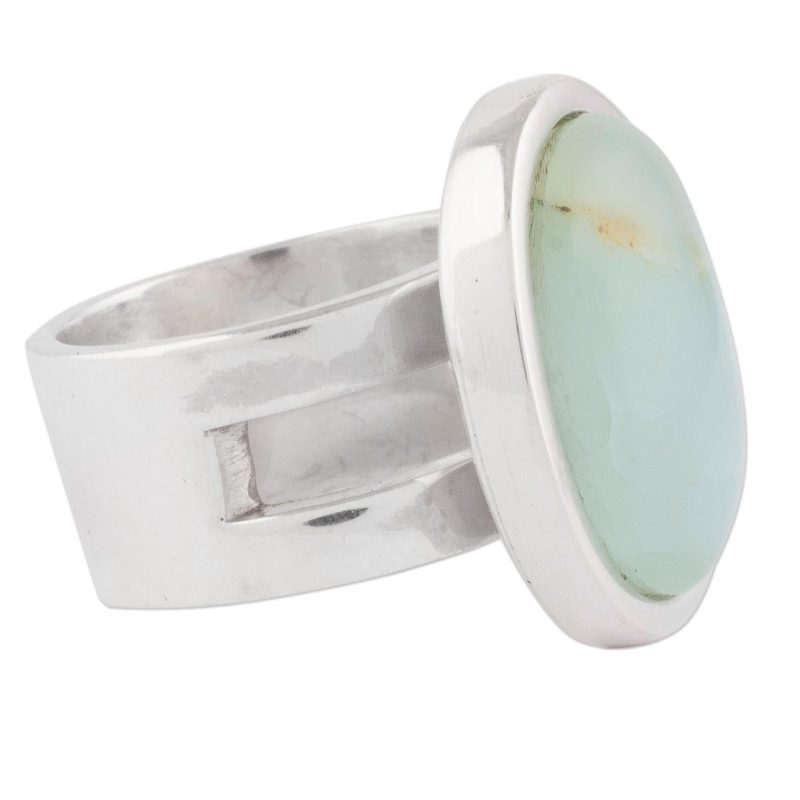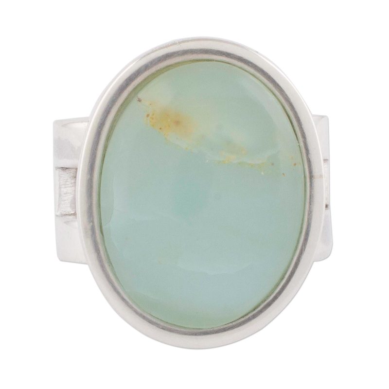 Ana Llapa designs a shining ring of sterling silver that possesses a modern aesthetic, crowned with an oval stone of sweet aqua-hued Andean opal. This elegant single-stone ring is a testament to Llapa's artistic vision.