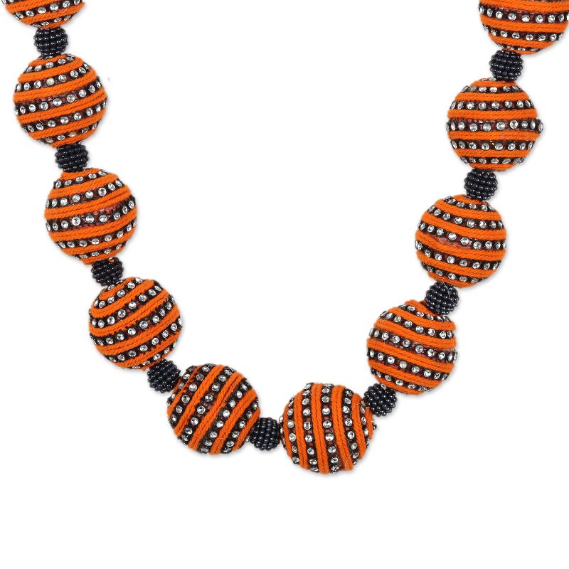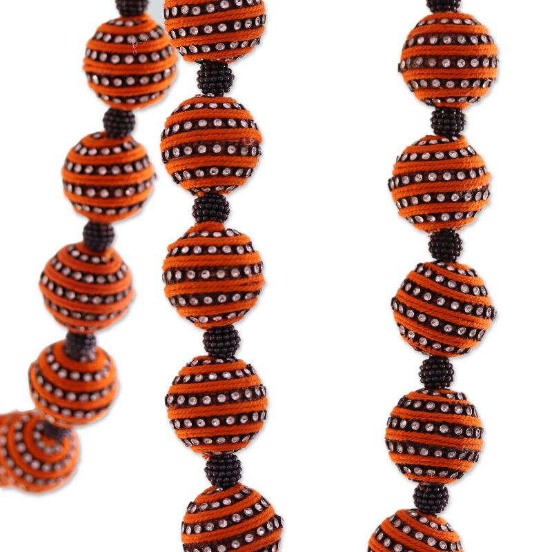 Decorate for harvest time, Halloween, or Thanksgiving with this lovely wool felt garland. Plastic balls are wrapped with alternating rows of orange cotton thread and rhinestones and strung along with smaller balls of black plastic beads, all on a cotton cord with loops for easy hanging. This fun and festive garland is designed by Pooja Arora of India.