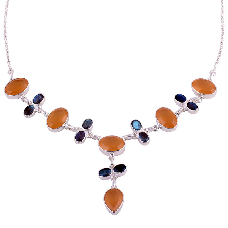 Designer Neetu Barathi of India presents this amazing necklace that exudes elegance and femininity. Like a breezy summer sunset, six cabochons of warm orange onyx are paired with ten cabochons of cool labradorite to create a wonderful, harmonious balance. Sterling silver links the gorgeous gemstones together, which shimmer brightly from their bezel settings. A high polish finish accentuates the luxurious appeal of the necklace.